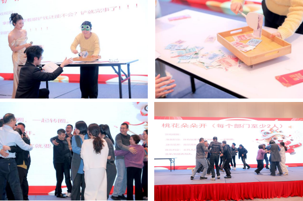 互动游戏环节更是趣味盎然,掀起一波又一波高潮。“金铲铲(蒙眼铲钱)” 游戏中,参与者蒙眼手持小铲,在铺满道具钱的区域奋力铲钱,台下观众加油声不断;“桃花朵朵开(绕圈抱团)” 考验着大家的反应速度与协作能力,欢声笑语此起彼伏;“夹纸运杯(夹着A4纸运杯子)” 则极具挑战性,参与者小心翼翼地用A4纸运送杯子,紧张又刺激。